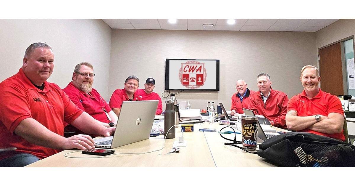 Pictured, left to right: CWA District 4 Bargaining Team Members include Greg Tennyson (CWA Local 4603 President), Jay Walther (CWA Local 4320 President), Tim Strong (CWA Local 4900 President), Jake Vick (CWA Local 4034 Vice President), Mike Schulte (CWA District 4 Staff Representative), Mike Handley (CWA District 4 Administrative Director), and Curt Hess (CWA District 4 Assistant to the Vice President).