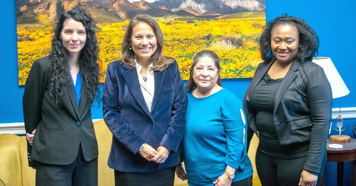 LanguageLine Solutions workers Karolina Yermak (left), Sara Ramirez (second from right), and Yves Valerus (right) visited Capitol Hill, where they met with members of the Labor Caucus and several representatives, including Congresswoman Veronica Escobar (D-Texas).